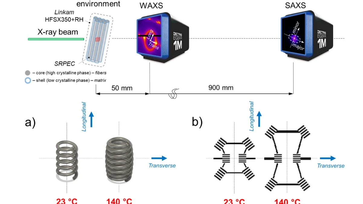 Araştırmacılar, UHMWPE liflerine dayalı kendinden güçlendirilmiş kompozit bir numuneyi doğrudan X-ışını demeti içinde 140°C’ye kadar ısıttı ve aynı anda dar açılı (SAXS) ve geniş açılı (WAXS) X-ışını saçılımı kaydetti. Bu eşzamanlı yaklaşım, kristalin ve amorf fazların yeniden düzenlenmesini nanometre çözünürlüğünde gerçek zamanlı izlemeye olanak tanıdı. Böylece kaydedilen nano ölçekli değişimler, malzemenin makroskobik şekil geri kazanım davranışıyla doğrudan ilişkilendirildi.