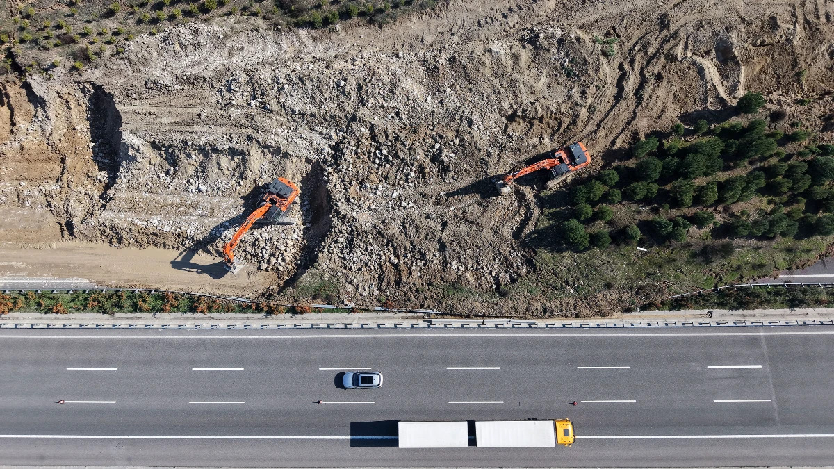 Manisa'nın Turgutlu ilçesinde 18 Şubat'ta meydana gelen toprak kaymasının ardından kontrollü olarak ulaşıma açılan İstanbul-İzmir Otoyolu'ndaki çalışmalar devam ediyor.