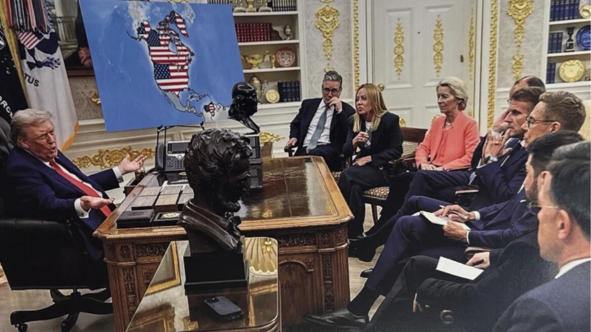 ABD Başkanı Donald Trump'ın, sosyal medyada yaptığı paylaşımda, daha önce Avrupalı liderleri Oval Ofis'te ağırlarken çekilmiş bir fotoğrafı kullanarak, fotoğrafın üzerine Kanada, Venezuela ve Grönland'ın ABD toprağı olarak gösterildiği bir harita görüntüsü eklediği dikkat çekti.