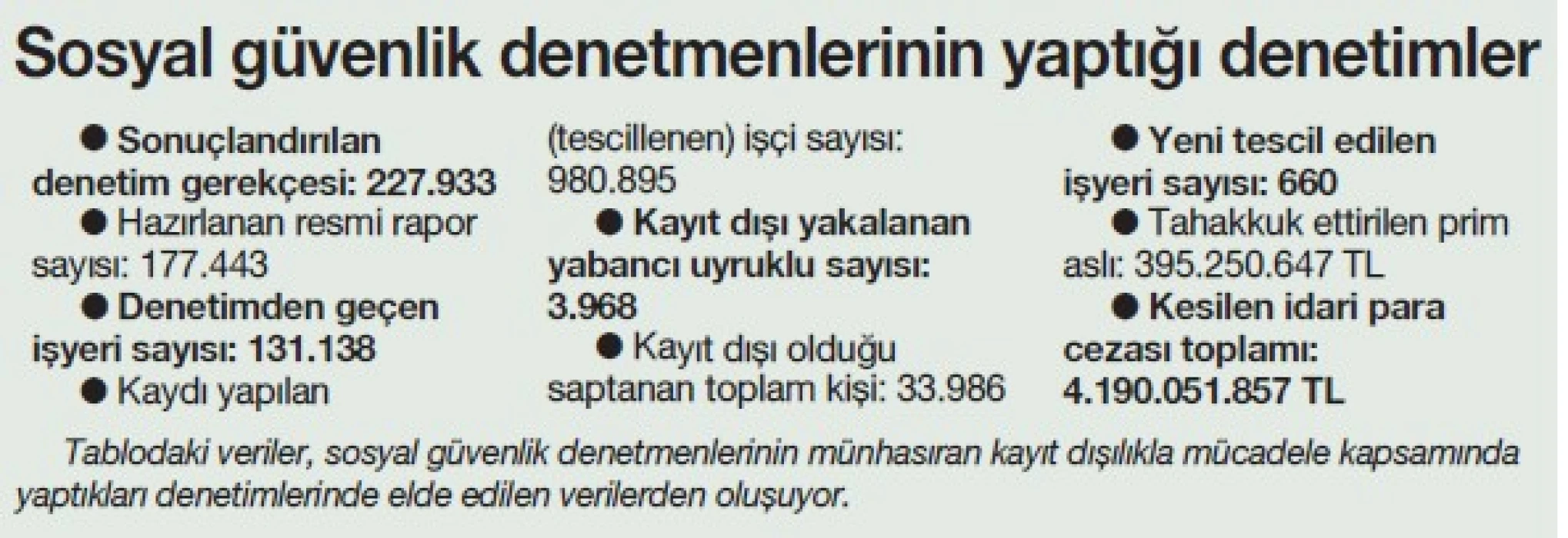 Kurum tarafından kayıt dışı istihdamla mücadele kapsamında gerçekleştirilen denetim faaliyetleri ve incelemeler sonucunda 2025 yılında toplamda 369 bin 573 kişinin kayıt dışı çalıştırıldığı ve 7 bin 801 işletmenin tamamen kaçak (tescilsiz) olduğu tespit edilerek yasal işlemler yapıldı.
