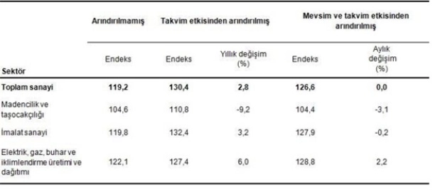 Türkiye İstatistik Kurumu, sanayi üretimi endeksini açıkladı. Söz konusu verilere göre 2015 Eylül ayında sanayi üretimi bir önceki aya göre değişmedi, bir önceki yılın aynı ayına göre ise yüzde 2.8 oranında arttı.